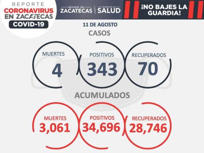 Zacatecas, Zac., 11 de agosto de 2021.- Este miércoles, la Secretaría de Salud de Zacatecas (SSZ) reportó cuatro fallecimientos y 343 nuevos cont... [continúa]