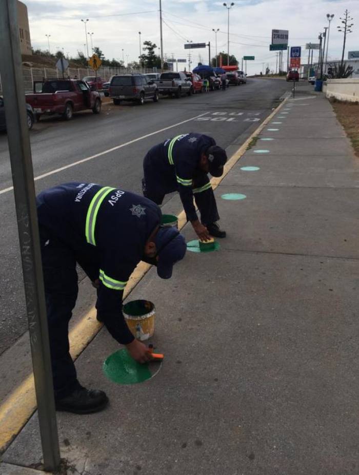 COLOCAN SEÑALÉTICA DE SANA DISTANCIA EN PARADEROS DE RUTAS DE TRANSPORTE.